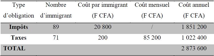 La lecture du tableau montre que les immigrants enquêtés payent annuellement 2873600F CFA comme taxes et impôts. Nos efforts pour obtenir des informations relatives à la part de l’ensemble des immigrants au budget communal ont été vains.