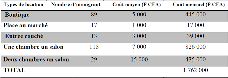 De la lecture du tableau, il ressort que le coût total de location payé par les immigrants enquêtés est de 1726000 F CFA par mois. Il faut noter que l’immigration des Nigérians participe à la flambée des prix des loyers et des boutiques.