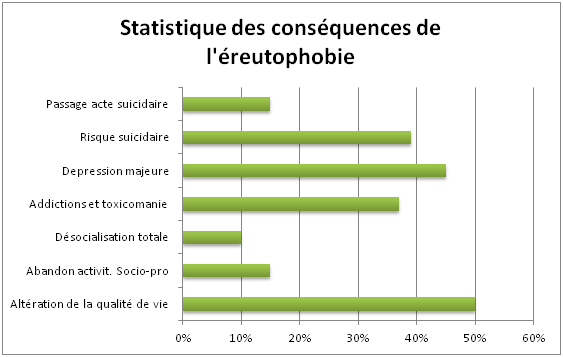 Malheureusement, à côté de ceux qui arrivent à se forger une défense psychologique suffisante, certains ressentent des conséquences sur leur moral considérablement. Ils sont alors plongés dans des dépressions profondes et prolongées qui peuvent amener à un alcoolisme et à la toxicomanie. En effet, les éreutophobes se sentent parfois mieux sous l’emprise de l’alcool,… car ils se détendent plus facilement même si cela peut paraitre paradoxal puisque l’alcool dilate les vaisseaux sanguins. D’autres réagiraient plus violemment : d’après le Docteur Valla, certains patients auraient réagi avec violence envers leur interlocuteur. D’autres patients encore répondent à leur phobie avec violence mais envers eux-mêmes : tatouages sur le visage, saignées, mais aussi par des suicides ! L’éreutophobie n’est surtout pas à prendre à la légère. Certains étudiants éreutophobes ont même été jusqu’à abandonner leur étude alors qu’elle était brillante ! En effet, l’éreutophobie peut avoir un certain impact sur les performances scolaires/professionnelles. Le Docteur Valla explique encore qu’il a vu personnellement des dirigeants d’entreprise affirmer qu’ils éprouvaient beaucoup de difficultés à continuer leur vie professionnelle remettant ainsi en jeu l’avenir de leur firme. Ce même chirurgien arrive à apporter quelques statistiques (32):