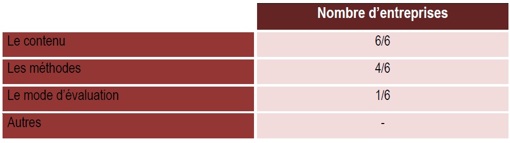 Nombre d’entreprises Le contenu 6/6 Les méthodes 4/6 Le mode d’évaluation 1/6 Autres –