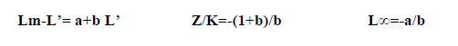 Ainsi, en portant sur un graphique Lm-L’ en fonction de L’ , on obtient une régression linéaire à partir de laquelle on peut estimer a et b et par conséquent L∞ et Z /K (Sparre et Venema, 1996).