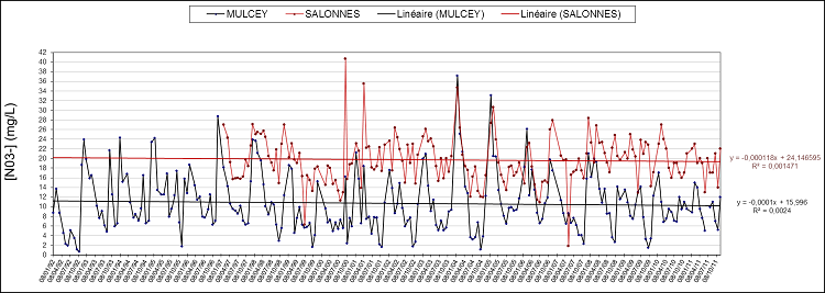 Comme pour l’ammonium, les deux tracés sont relativement indépendants, Salonnes étant dominée par le nitrate provenant du secteur amont de la petite Seille et non de la Seille. Les phases caractéristiques sont marquées sur le profil de Mulcey, notamment par la réduction des teneurs maximales. On y retrouve l’influence supposée des mesures ACNAT et MAE dans un premier temps, des contrats CTE dans un second temps et des dispositifs Aquae-Seille et MAEt depuis 2005 et 2007. L’influence des dispositifs agri-environnementaux dans le périmètre Natura 2000 semble relativement significative.