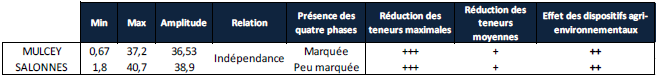 Le secteur médian subit une pression agricole plus faible que le secteur amont. Les teneurs en nitrate y sont cependant plus élevées qu’à Mulcey, ce qui semble confirmer que c’est en aval que l’ammonium produit en secteur amont se dégrade. Les phases caractéristiques sont pratiquement absentes. Le secteur médian semble subir l’influence de la pression agricole du secteur amont et constitue étrangement le seul secteur sur lequel les dispositifs agrienvironnementaux n’ont pas d’impact significatif.