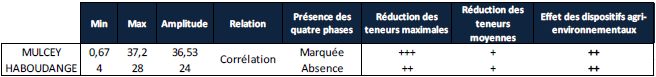 La Station Mulcey est fortement soumise à la pression agricole mais présente des teneurs en nitrate jusqu’à deux fois plus faibles que dans les autres secteurs. La dégradation des grandes quantités d’ammonium mesurées dans ce secteur n’a probablement pas lieu ici mais plus en aval. Hadoudange possède des teneurs supérieures pour une pression agricole équivalente qui peuvent être dues à l’effet de concentration du nitrate dans la petite Seille dont le pouvoir épurateur est moindre. L’évolution des teneurs maximales met en évidence les quatre phases caractéristiques. Une première stabilisation des valeurs maximales de 1999 à 2001 peut être imputable au développement des mesures ACNAT, des MAE puis des CTE. Depuis 2008, les teneurs maximales diminuent de manière régulière sur les deux stations, en accord avec les objectifs du programme Aquae-Seille et des MAEt. Dans ce secteur à forte pression agricole, il semblerait que les dispositifs agri-environnementaux aient un impact relativement significatif sur les teneurs en nitrate. Il convient de vérifier que les efforts fournis en amont pour une meilleure gestion de la fertilisation azotée portent leurs fruits en aval, lieu de dégradation de l’ammonium en nitrate.