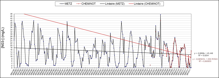 Les deux stations du secteur aval appartiennent à des paysages différents mais présentent des tracés identiques depuis 2007. Le nitrate mesuré à Cheminot se retrouve à Metz, sans qu’il n’y ait eu ni dégradation ni production supplémentaire. Ce secteur possède donc un pouvoir auto épurateur plus faible qu’en amont. Les teneurs observées à Metz depuis 2007 proviennent de l’activité agricole puisque les nitrates proviennent de l’amont et ne sont pas produits sur place. Avant 2007 en revanche, il est possible qu’une part du nitrate ait une origine industrielle ou urbaine, plus particulièrement dans la période 1992 -1999. Les phases caractéristiques sont bien présentes, autant par la réduction des teneurs maximales que par la réduction des teneurs moyennes. Le nitrate moyen est en baisse depuis 2008 et les dispositifs agri-environnementaux semblent avoir une influence relativement significative sur les teneurs observées, notamment par la gestion améliorée de la pollution azotée en secteur amont.
