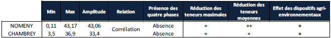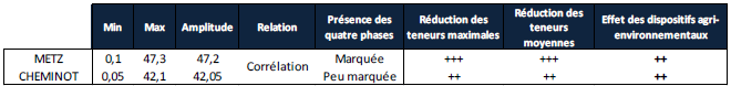 De manière générale, les courbes de l’évolution des teneurs en ammonium et en nitrate présentent des fluctuations inter et intra-annuelles importantes attribuables aux variations des conditions de température et de pluviométrie. La mise en relation des teneurs en nitrate et des relevés pluviométriques serait intéressante pour le confirmer. De même, les valeurs extrêmes sont liées à des évènements climatiques marquants, et non à des pollutions azotées ponctuelles. D’autre part, la majeure partie du bassin versant de la Seille connait une baisse légère mais confirmée de ses teneurs en nitrate qui avoisinent tout de même 22 mg/L en moyenne. En ce sens, cette étude tend à démontrer que les contrats agri-environnementaux et les nombreuses mesures territoriales de réduction de la pollution azotée – mises en oeuvre sur le bassin versant depuis plus de 20 ans par les politiques publiques – ont des effets relativement significatifs mais encore insuffisants.