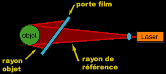 The principle is the following mounting, place the holographic film or plate between the object and the laser. The laser light passes through the hologram plate and then typing the object and is then reflected on the plate. In this case the laser beam plays both the role of the reference beam and object beam, the interference of the two then gives the image printed on the plate producing the hologram. In order to see the hologram it is necessary to place the light on the same side as the observer.(6)
