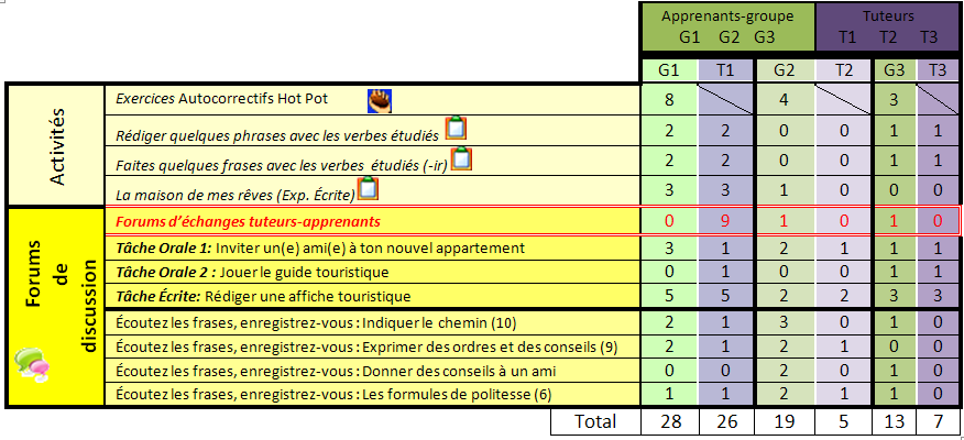 La comparaison entre les résultats chiffrés et recueillis sur les quatre tableaux s’avère très difficile, étant donné le nombre très faible de productions faites par les apprenants par rapport au nombre total d’inscrits. Nous ne pourrions pas nous appuyer uniquement sur ces chiffres à eux-mêmes pour émettre des hypothèses abordant le type de tutorat effectué ou les effets d’un tutorat proactif ou réactif sur les apprenants. Observons que le Groupe 2 a toujours eu ses séances en présentiel au laboratoire multimédia de l’Alliance, et que le Groupe 3 y a eu quelques séances. Cela a offert aux apprenants de ces deux groupes la possibilité réelle (matérielle) de s’enregistrer et de poster leurs productions orales (étant toujours le moins nombreuses). Les apprenants des groupes G2 et G3 ont ainsi pu travailler les activités et tâches écrites pendant les séances de regroupement avec leurs tuteurs, qui étaient sur place pour les aider. Lors de ces séances, les propres tuteurs (T 2 et T3) en ont pu tirer profit et corriger les travaux des apprenants ainsi que leur envoyer des feedbacks immédiats. Cela pourrait expliquer le rapprochement occasionnel entre le nombre de contributions des trois groupes (surtout entre G1 et G2 où l’écart est dérisoire), malgré un possible tutorat peu proactif. Ceci aurait aussi pu compenser un tutorat uniquement réactif ou « réactif à peine » (Groupe 3) de la part des tuteurs des groupes 2 et 3.