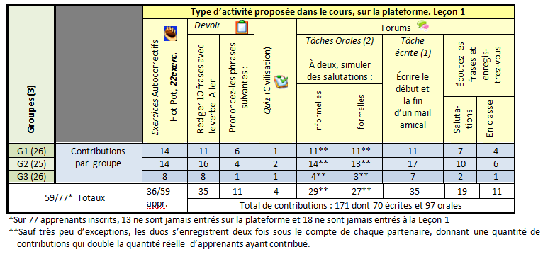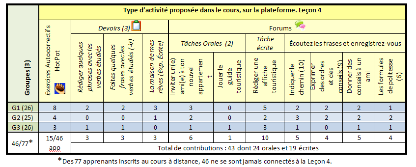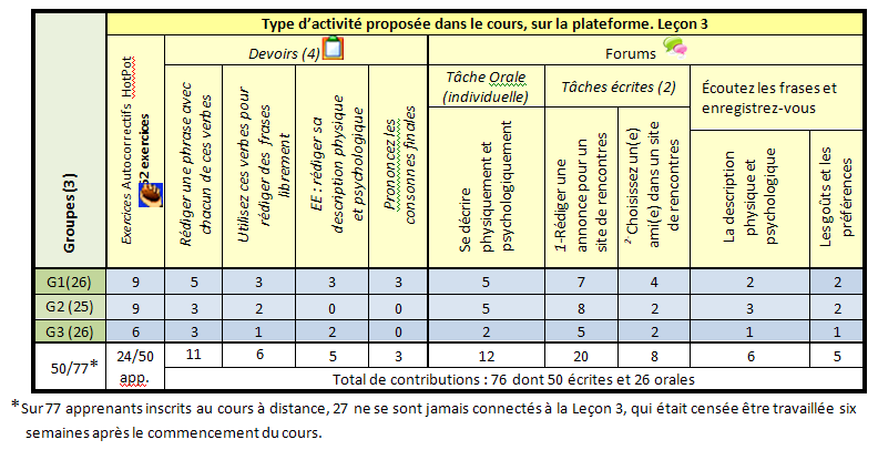 Dans la Leçon 2 il y a plus de propositions d’activités de production orale (6) que dans la première leçon (5) ; nous y trouvons aussi une seule tâche écrite proposée. Le total de contributions des trois groupes montre que les apprenants qui sont entrés à la Leçon 2, et qui ne se sont pas contentés de la visiter passivement, ont continué à faire bien d’exercices autocorrectifs de type HotPot (cette leçon en propose 30). Alors, sur les 56 apprenants qui sont entrés à cette deuxième leçon, 32 en ont fait au moins un, mais la plupart d’entre eux en a fait plusieurs. Quant à la complexité des tâches, cette fois aussi la « tâche » écrite est très facile en termes de compétences linguistiques (compléter une fiche personnelle qui leur est donnée). Elle est plus simple que les tâches et activités orales en termes d’aisance requise avec l’outil informatique.