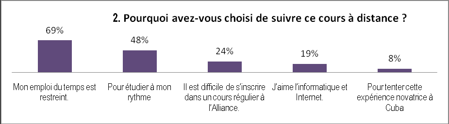 Le pourcentage des réponses que nous pouvons voir ci-dessus, indiquent que les inscrits imaginaient au départ que ce cours serait beaucoup plus flexible qu’il ne l’était en réalité. Cette « flexibilité » comprenait la progression pédagogique, le calendrier du cours et le temps dont les apprenants devaient disposer. Néanmoins, ni l’annonce du lancement de cette FOAD ni le processus d’inscription n’ont prévenu les apprenants sur le temps dont ils allaient avoir besoin par semaine, afin de travailler en autonomie le matériel proposé sur la plateforme. Alors, il serait pertinent que les apprenants soient mieux informés à ce sujet avant de commencer le cours. Dans ce sens, il faudrait également qu’ils soient mieux guidés tout au long du cours par leurs tuteurs. De même, il serait judicieux que la Direction de l’AF accepte d’une fois pour toutes que ce cours est, en termes de temps et de progression pédagogique, un cours de type normal et non pas un cours accéléré ou intensif comme c’était le cas de la plupart des cours traditionnels à l’Alliance (jusqu’à 2012). Les différences, les particularités entre cette FOAD et les cours traditionnels de l’AF, résideraient dans la distance, la médiatisation, les rôles du tuteur, la nature des interactions, pour en citer quelques uns. Avec ce cours l’AF offre la possibilité d’apprendre autrement et non d’apprendre davantage et plus vite.