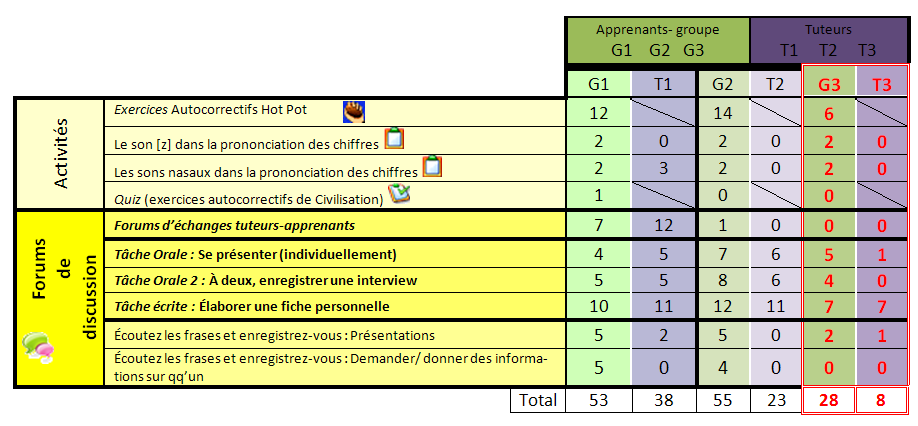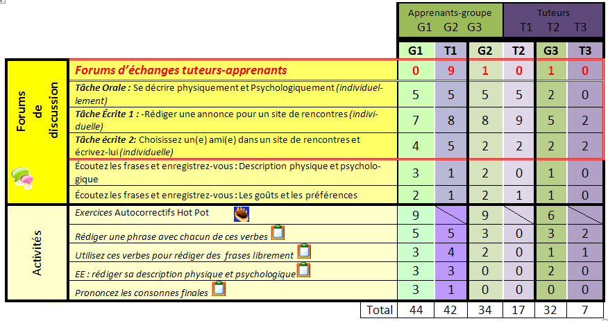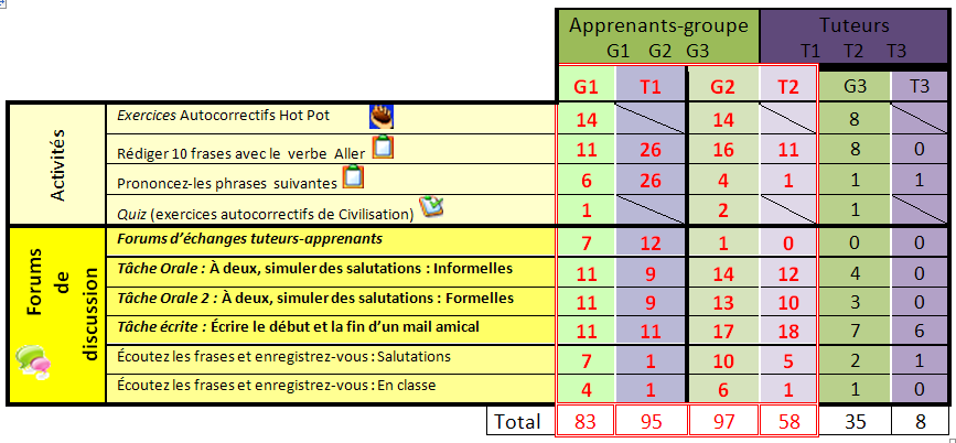 La comparaison entre les résultats chiffrés et recueillis sur les quatre tableaux s’avère très difficile, étant donné le nombre très faible de productions faites par les apprenants par rapport au nombre total d’inscrits. Nous ne pourrions pas nous appuyer uniquement sur ces chiffres à eux-mêmes pour émettre des hypothèses abordant le type de tutorat effectué ou les effets d’un tutorat proactif ou réactif sur les apprenants. Observons que le Groupe 2 a toujours eu ses séances en présentiel au laboratoire multimédia de l’Alliance, et que le Groupe 3 y a eu quelques séances. Cela a offert aux apprenants de ces deux groupes la possibilité réelle (matérielle) de s’enregistrer et de poster leurs productions orales (étant toujours le moins nombreuses). Les apprenants des groupes G2 et G3 ont ainsi pu travailler les activités et tâches écrites pendant les séances de regroupement avec leurs tuteurs, qui étaient sur place pour les aider. Lors de ces séances, les propres tuteurs (T 2 et T3) en ont pu tirer profit et corriger les travaux des apprenants ainsi que leur envoyer des feedbacks immédiats. Cela pourrait expliquer le rapprochement occasionnel entre le nombre de contributions des trois groupes (surtout entre G1 et G2 où l’écart est dérisoire), malgré un possible tutorat peu proactif. Ceci aurait aussi pu compenser un tutorat uniquement réactif ou « réactif à peine » (Groupe 3) de la part des tuteurs des groupes 2 et 3.