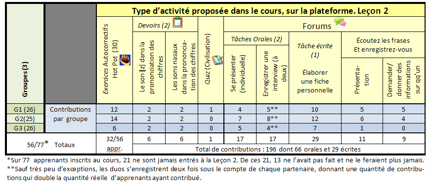 Dans la Leçon 2 il y a plus de propositions d’activités de production orale (6) que dans la première leçon (5) ; nous y trouvons aussi une seule tâche écrite proposée. Le total de contributions des trois groupes montre que les apprenants qui sont entrés à la Leçon 2, et qui ne se sont pas contentés de la visiter passivement, ont continué à faire bien d’exercices autocorrectifs de type HotPot (cette leçon en propose 30). Alors, sur les 56 apprenants qui sont entrés à cette deuxième leçon, 32 en ont fait au moins un, mais la plupart d’entre eux en a fait plusieurs. Quant à la complexité des tâches, cette fois aussi la « tâche » écrite est très facile en termes de compétences linguistiques (compléter une fiche personnelle qui leur est donnée). Elle est plus simple que les tâches et activités orales en termes d’aisance requise avec l’outil informatique.