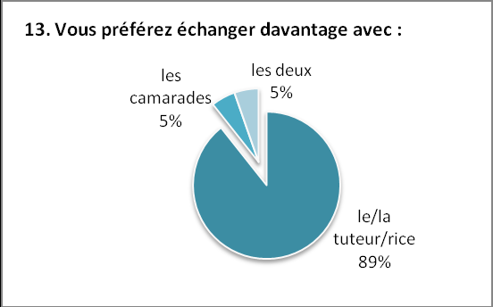 Tel que les apprenants ont déclaré dans la question 13 du premier questionnaire, la grande majorité préfère échanger directement avec le tuteur au lieu de le faire avec leurs collègues. Les interactions entre les apprenants (via le courriel, le forum d’échanges/ de tâches) aussi régulières soient-elles, ne suffiraient pas pour compenser l’absence du tuteur sur la plateforme, ou son manque d’interventions (un tuteur non proactif et même peu réactif). Les apprenants ont par conséquent besoin d’un tutorat proactif et d’un tuteur habituellement présent.