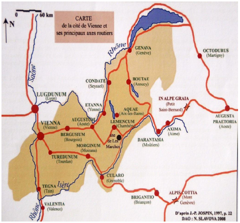 Figure 19 : Carte de l’Allobrogie d’après « La cité de Vienne : Un vaste territoire », Atlas du patrimoine de l’Isère, p 41, édition : Glénat. Publiée en creative commons sur wikimedia.