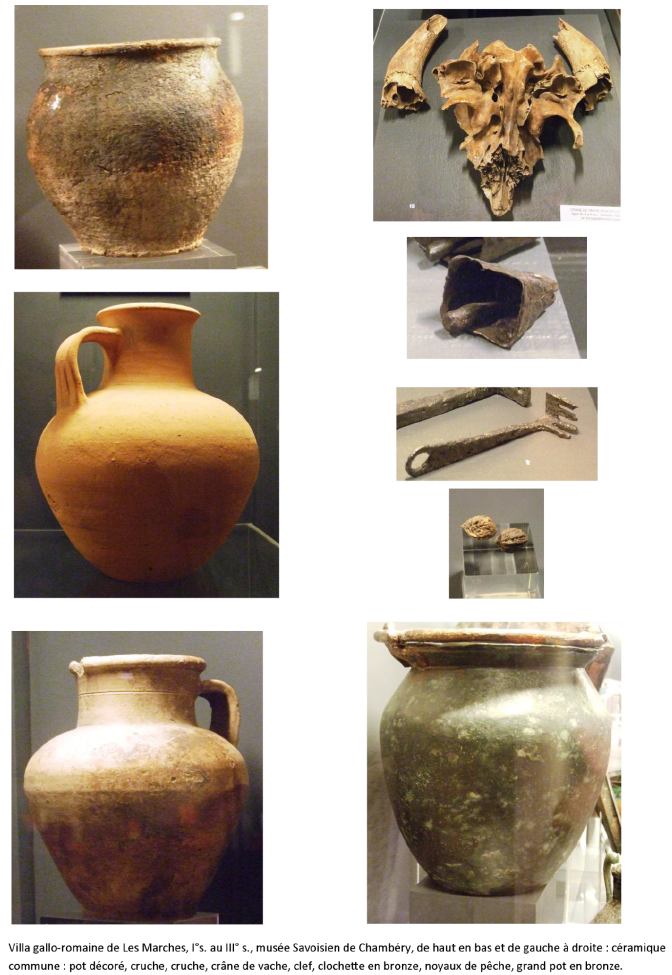 La villa gallo-romaine des Marches a été découverte lors de la construction de l’autoroute A41 au lieu-dit Bellevue. Avant d’être détruite par les travaux, elle a fait l’objet de fouilles de sauvetage en 1977 qui ont permis de mettre au jour les fondations de murs, et surtout un puits renfermant un mobilier abondant (Ferber, 1979). Ce mobilier, aujourd’hui exposé en partie au musée de Chambéry(36), se compose de vases, cruches, chaudrons, ornements, mais aussi de noyaux de pêches et de restes de petit bovidé. Les datations s’échelonnent du Ie au IIIes. ap. J.-C. La phase la plus active de cette villa se situe au IIe s. Cette période semble marquée par un essor général de l’habitat rural dans la vallée de l’Isère. Ce site est ensuite abandonné au IIIes siècle, ce qui est aussi le cas pour les autres villae des communes voisines.