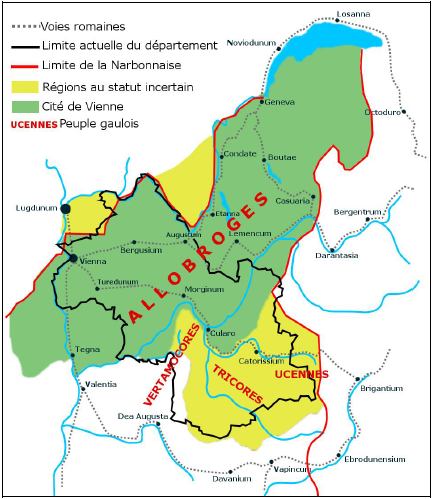 Figure 19 : Carte de l’Allobrogie d’après « La cité de Vienne : Un vaste territoire », Atlas du patrimoine de l’Isère, p 41, édition : Glénat. Publiée en creative commons sur wikimedia.