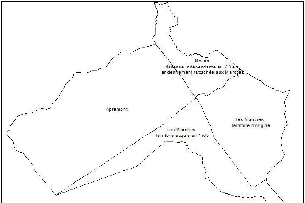 43 Le village de « Les Marches » garde actuellement la trace de sa fonction première à travers son nom. Au Moyen-âge, ce nom désigne les territoires en périphérie d’un état qui jouent un rôle de protection militaire.