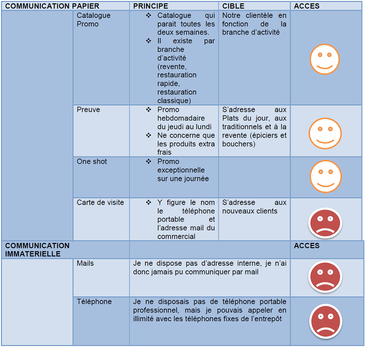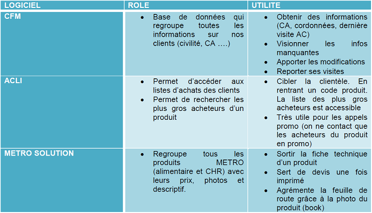 Voici la liste des outils de communication que METRO fournit à ses commerciaux. Le tableau les reprend tous et précise si je pouvais en disposer.