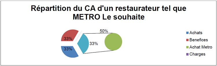 CA/3= une partie pour les charges (loyers, salaires) une partie de bénéfices, et une autre pour les achats. Nous estimons et souhaitons que nos clients achètent la moitié de leurs achats (alimentaire et matériel) chez METRO.