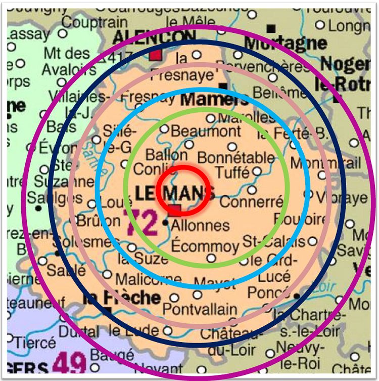 Le secteur s’étend sur toute la Sarthe et déborde sur l’Orne. Il est divisé en 7 zones nommées les zones isochrones. La première contient les communes les plus proches du Mans jusqu’à la septième qui contient les villes les plus éloignées.