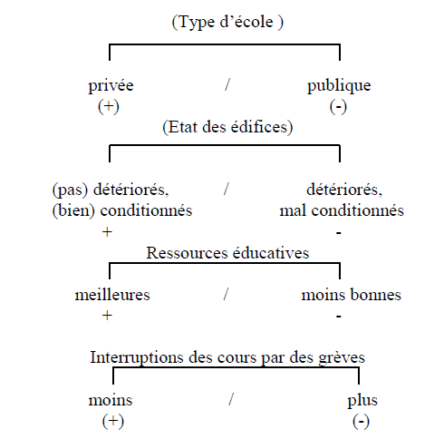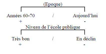Cette structure permet de voir que, dans le discours de notre répondante, l’école privée actuelle a toujours un meilleur niveau que l’école publique mais inférieur à ce qu’il était il y a dix ans. L’école privée actuelle est également surpeuplée, ce qui n’est pas le cas de l’école publique d’après Mme S., puisqu’une classe dans le public compte une vingtaine d’élèves.