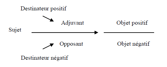 « Souvent, le matériau présente le sujet comme partiellement démuni dans la mise en oeuvre de sa quête, partiellement incapable de mener les actions qui lui permettent d’atteindre l’objet. L’adjuvant, est ce (ou celui) qui aide le sujet dans sa quête, qui favorise l’obtention de l’objet positif. Celui qui détient ou possède l’adjuvant et qui permet au sujet d’en bénéficier pour mener à bien sa quête est le destinateur positif. De manière symétrique, certains éléments peuvent handicaper le sujet dans sa quête. L’opposant est ce (ou celui) qui contrarie le sujet dans sa quête, qui compromet ou empêche l’obtention de l’objet positif en poussant le sujet vers l’objet négatif. La réalité qui envoie l’opposant « barrer la route » du sujet est le destinateur négatif ».(218)