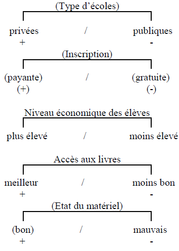 De même, elle raconte qu’aujourd’hui les écoles privées sont surpeuplées parce que de plus en plus de parents y inscrivent leurs enfants : « ce que recherchent certains parents, c’est que les enfants reçoivent une meilleur qualité éducative qu’à l’école publique…alors elles sont surpeuplées, tu as une école publique avec une classe de 25 enfants et dans l’école privée, 45 ! » On peut dès lors représenter cette situation par une structure croisée reprenant deux disjonctions : celle qui prend en compte la qualité de l’éducation et, celle qui prend en compte le nombre d’élèves.