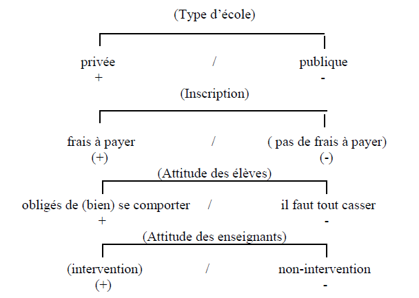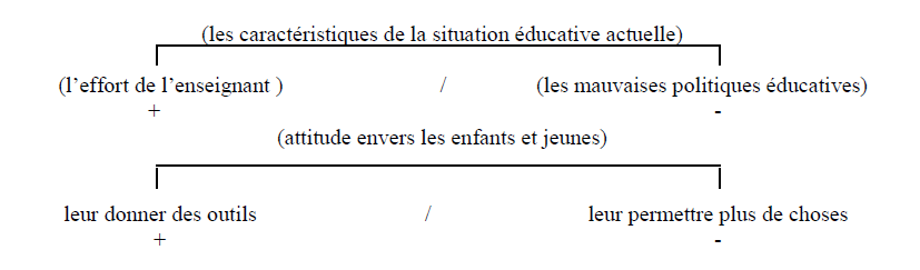 Mme D. nous dit que dans les écoles privées, il y a des frais à payer et donc que les enfants sont tenus de bien se comporter. Cependant, il n’est pas possible de savoir si elle valorise pour autant le fait de payer par rapport à l’inscription gratuite. C’est pourquoi nous avons mis ces valorisations entre parenthèses. Ensuite, si elle parle de la non-intervention des professeurs dans le public, elle n’évoque pas l’intervention dans le privé. Nous plaçons donc également ce terme entre parenthèses.