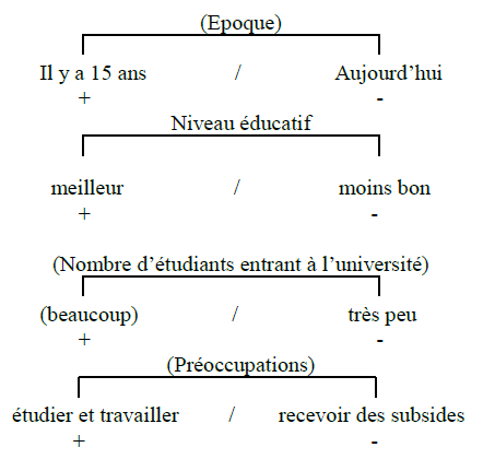 On peut donc représenter cette opposition entre la situation actuelle et le passé, par une structure parallèle qui reprend les différents éléments énoncés par notre locutrice :