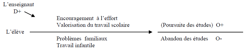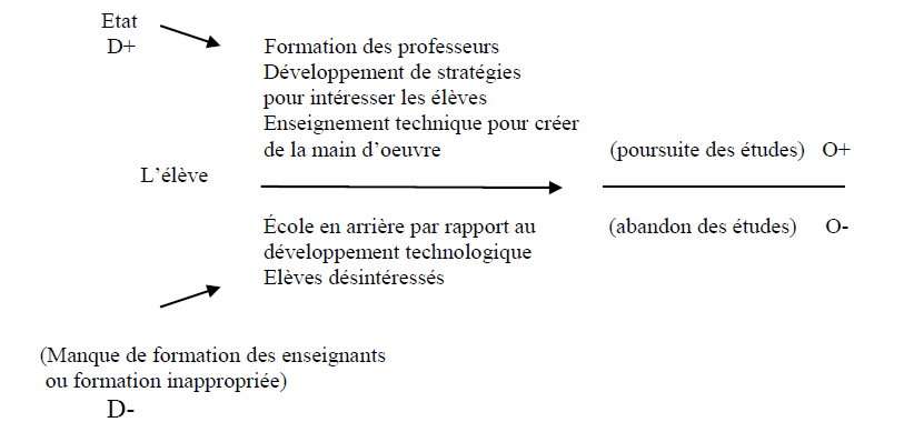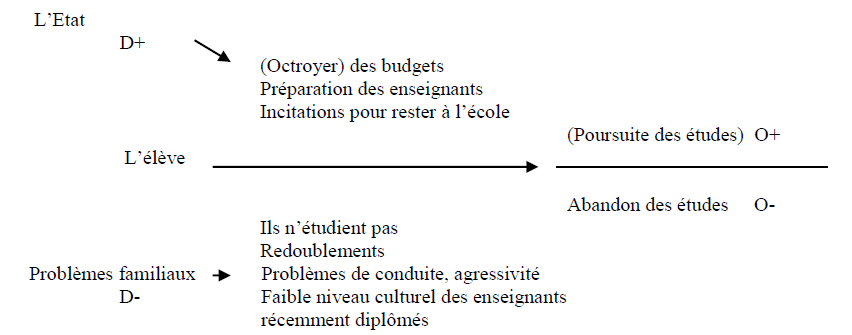 Ce schéma permet donc de résumer le discours de Mme P. par rapport à la question des abandons scolaires. L’Etat est vu comme le destinateur positif, c’est-à-dire celui qui envoie les adjuvants permettant d’atteindre l’objectif : si l’Etat donne des budgets, des incitations, s’occupe de la formation des enseignants…les élèves seraient plus enclins à poursuivre leurs études (entre parenthèses parce que Mme P. ne le dit pas en ces termes-là).