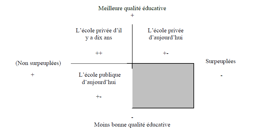 La quatrième case correspondrait à une école où la qualité éducative ne serait pas très bonne et où il y aurait trop d’élèves, mais comme elle n’est pas évoquée par notre répondante, cette case se trouve ici hachurée.
