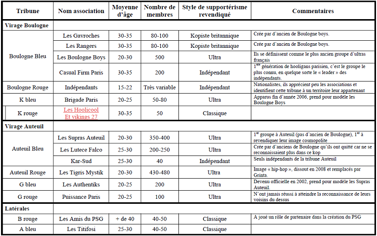 Aujourd’hui, les trois groupes qui ont gardé leur place au Parc sont les Titifosi (tribune A bleu), les Hoolicool (Tribune K rouge) et les Amis du PSG (tribune B rouge). Toutes les autres associations n’existent plus dans le cadre du plan Leproux.