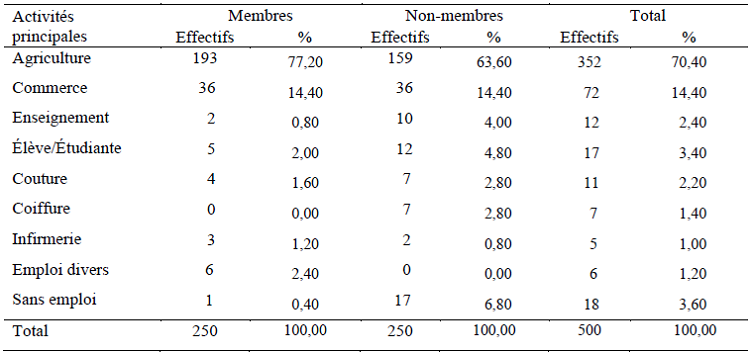 L’activité principale pratiquée est souvent une preuve de revenus ou non et peut déterminer la capacité d’un individu à épargner ou à contracter un crédit. Le tableau 9 présente la répartition des enquêtées selon l’activité principale.