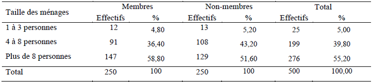 Comme le montre le tableau 11, la taille des ménages des enquêtées est grande quelque soit le groupe considéré ; c’est ainsi que 55,20% des ménages ont plus de 8 personnes. Locoh (1994) explique cette grandeur de la taille des ménages par deux phénomènes : l’âge d’entrée en union et la précocité des rapports sexuelles. L’auteur continue en disant que 36% de femmes au Cameroun entre en union entre 15 et 19 ans. Le tableau 11 ressort également que 39,80 % des femmes résident dans des ménages de 4 à 8 personnes ce qui est le résultat des programmes de planning familial en milieu rural soutenus par l’Etat selon Locoh et Makdessi (1996). Mais, cette tendance haussière des personnes vivant dans un ménage peut être attribuée au type de famille existant en Afrique qui ne se limite pas seulement aux parents et aux enfants mais donne aussi une place aux cousins, cousines, grands-parents…etc. Notons par ailleurs, que les femmes ayant plus de 8 personnes dans leur ménage sont beaucoup plus des membres des EMF soit 58,80% contre 51,60% pour les non membres, cette forte représentativité des membres peut être attribuée au fait que les ménages ayant plus de « bouches à nourrir » sont obligés à trouver des sources de prêts d’argent sûres, disponibles et continues pour l’alimentation des membres de la famille.
