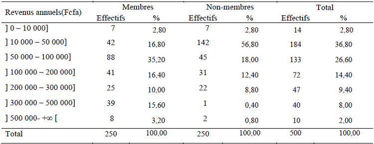 Les données recueillies permettent aussi de situer le revenu annuel moyen d’un membre à 210 608 Fcfa contre 70 840 Fcfa pour les non membres soit une différence de 139 768 Fcfa.