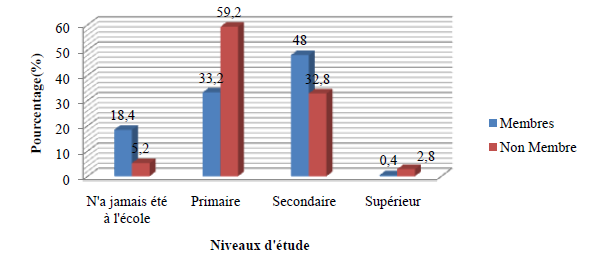 Il ressort de la figure 4 que 76,40% des enquêtées (membres et non membres) ont au moins fait des études primaires. Ce niveau élevé d’alphabétisme constitue un atout pour ces « femmes » qui peuvent jouer le rôle de leaders ou de responsables de groupes et même de constituer de véritables intermédiaires entre le monde rural et les partenaires extérieurs (Fongang, 2008). Par ailleurs, 18,40% de membres n’ont jamais été à l’école, ce qui les met en marge de tout processus de développement. Or, l’éducation générale et l’alphabétisation des femmes sont des éléments importants si celles-ci n’ont pas atteint leur plein potentiel et ne sont pas émancipées. L’analphabétisme crée une situation de dépendance auprès des autres qui peut limiter un individu dans son pouvoir d’action potentiel (Cheston et Kuhn, 2006).