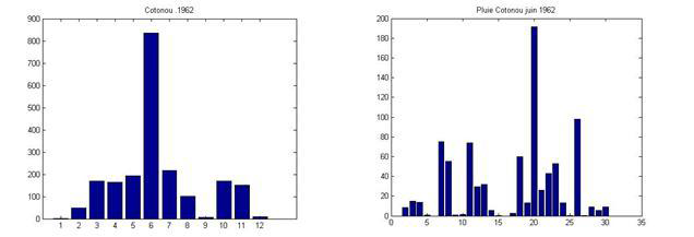 Figure 4.2 : Cumul des précipitations mensuelles (à gauche) et journalières en Juin 1962 (à droite) à Cotonou