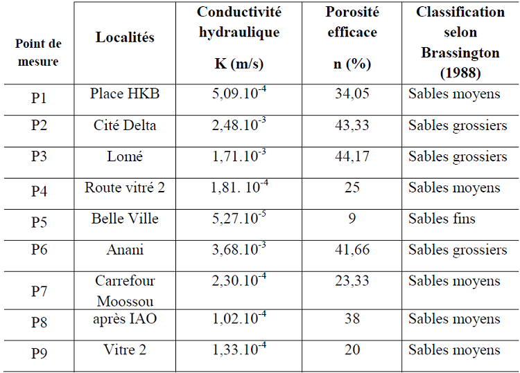 L’analyse de ce tableau montre que les conductivités hydrauliques varient de 5,27.10-5 m/s (Belle-Ville) à 3,68.10-3 m/s (Anani). Trois classes sont obtenues.