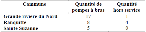 Au moment de l’étude, on a pu répertorier un total de 13 puits. Ces puits sont situés dans la zone basse du bassin versant notamment dans les communes de Limonade, de Quartier Morin et de Grande Rivière du Nord. L’eau de puits est utilisée dans les activités domestiques et dans l’élevage.