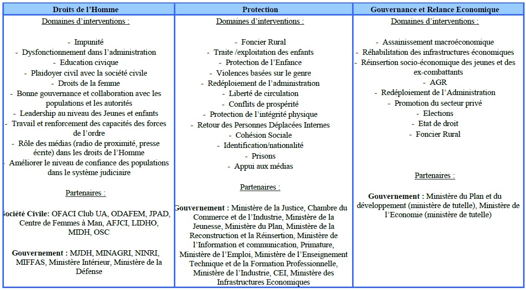 Les groupes fonctionnels regroupent toutes les agences du SNU et ONUCI sans implication d‘autres partenaires. Ils sont chargés de la gestion et du suivi et évaluation de: