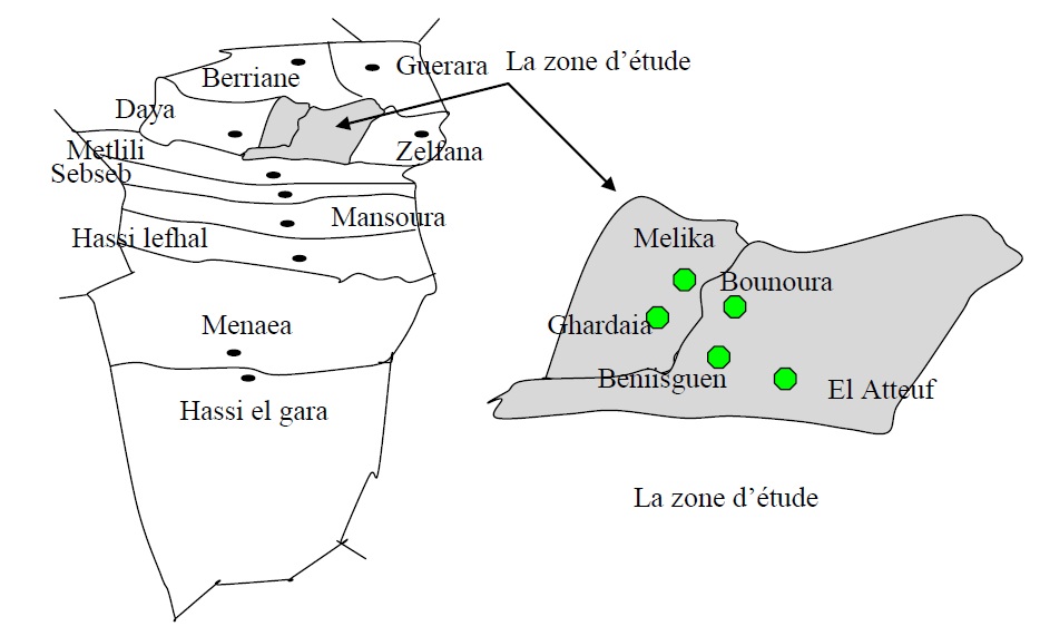 D’une superficie de 4037.34 Km2, la vallée du Mzab Occupe uniquement 5 % du territoire de la wilaya et comporte 177431 Habitants sur un total de 316422 habitants(2) 56 % de la population totale est donc concentrée sur cette région qui dénote un certain dynamisme économique et social.