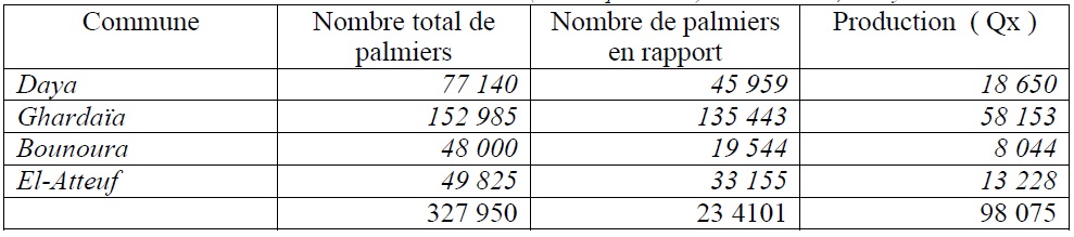 Tableau 4 : Production de dattes au niveau de la vallée (Statistiques 2009) source DPAT, Wilaya de Ghardaia.
