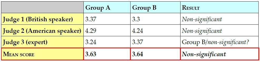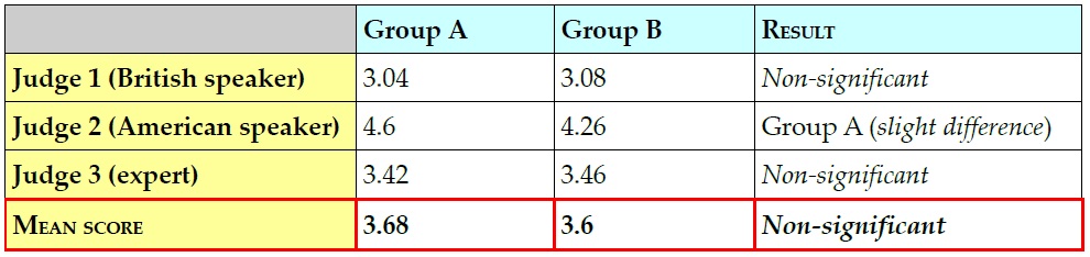 Concerning the mean scores of Judge 1 – the British English speaker –, Group A has