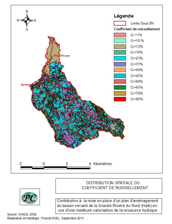 Sur la base des données de pente et de l’OCS de 1998 collectées au niveau du CNIGS et à partir de l’abaque tirée dans Hydrology, a science of nature d’André Musy (voir annexe 1), des coefficients de ruissellement ont été déterminés sur toute l’étendue du BV. Les pentes du bassin varient de 2% à 60 %. Les coefficients de ruissellement calculés oscillent entre 1% à 80 %. Cependant, les coefficients de ruissellement de 13%, de 31 %, de 45 % et 65 % sont les plus rencontrés au niveau du BV. En effet, le coefficient de 45 % est prédominant. Il caractérise presque tous les sous BV. Le coefficient de 13 % est surtout présent dans les sous BV en aval du bassin versant, celui de 31% au niveau de Picot, de Caracol et de Goyave, celui de 65 % dans les sous BV GRN1, GRN2 et Quitemoin. La répartition spatiale du coefficient de ruissellement est donnée dans la carte 4-7.