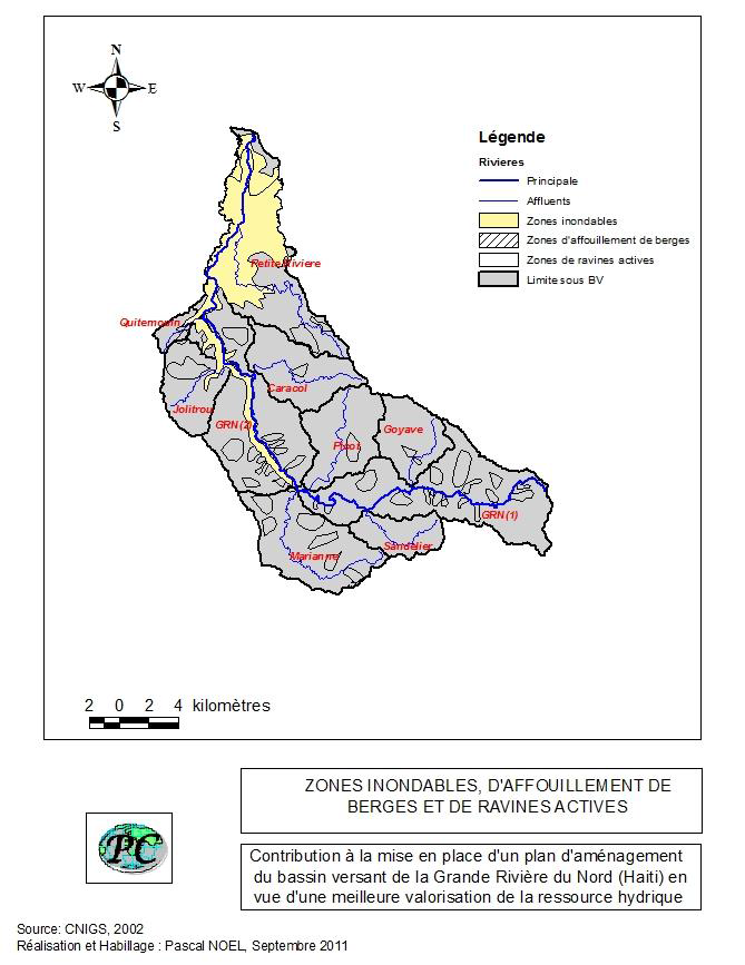 Des ravines actives sont présentes dans presque tous les sous BV. Non corrigées, ces ravines à partir des eaux qu’elles drainent accentuent le risque des désastres au niveau des agglomérations des sous BV de GRN2 et Petite Rivière d’inondation (voir carte 4-8).