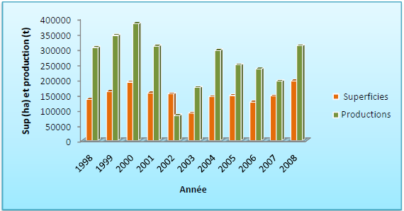 De 1988 à 2001 les rendements agricoles ont connu une hausse annuelle continue. En 2002 ils ont baissé presque de moitié. A partir de 2003 jusqu’en 2005, il y a encore une hausse progressive. De 2006 à 2007 les taux de rendements ont connu à nouveau une baisse qui est très marquée en 2007. En 2008, il y a une très forte augmentation des rendements qui ont presque doublé mais sans atteindre le pic de 2005. Les plus faibles taux de rendements sont enregistrés en 2002 et 2007.