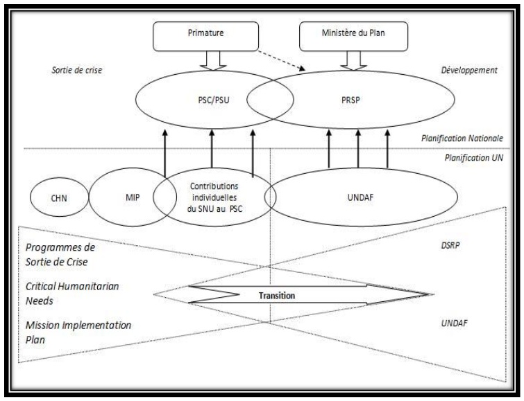 Juste avant les élections présidentielles d‘octobre/novembre 2010, et eu égard a la diminution progressive des besoins humanitaires face a la reprise des activités de développement ; le processus de transition avait nécessité l‘implication de nouveaux outils de planification à moyen et long terme comme les DSRP et UNDAF, une possible désactivation du système de clusters humanitaires et un retrait graduel des organismes humanitaires (OCHA, ONGs,…). Avec le relais des entités de développement (Agences des Nations unies ou départements ministériels) pour les fonctions de coordination qui restaient encore utiles, l‘appropriation de la coordination par les institutions étatiques afin de répondre aux politiques nationales serait tel que schématisé ci-après :