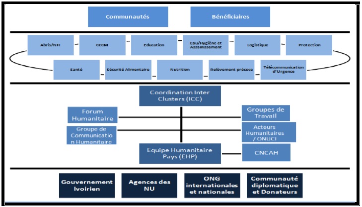 L‘ensemble de la structure de coordination humanitaire (clusters, inter-cluster, HCT, Forum d‘information humanitaire) a été progressivement réactivée en Côte d‘Ivoire à partir de janvier 2011au niveau national et régional, principalement à l‘ouest du pays, la zone qui demeure la plus affectée par les effets de la crise postélectorale.
