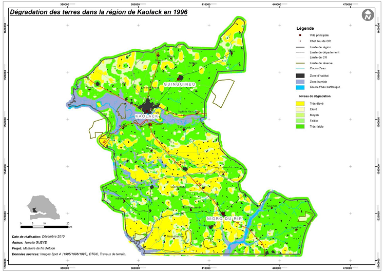 Les cartes ci-après illustrent la dégradation des terres dans la région de Kaolack dans les années 1996, 2000 et 2010 soit dans les 15 dernières années.