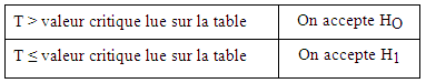 Ainsi après lecture dans la table de la valeur critique de T, nous pouvons nous prononcer de la manière suivante :